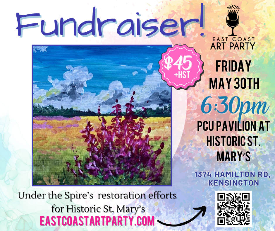 Tickets are $45+HST, and $15 from every sale goes directly to the restoration fundraiser for our cherished venue. Bring your friends and enjoy the inspiring setting, and help preserve St. Mary’s legacy, one vibrant brushstroke at a time.