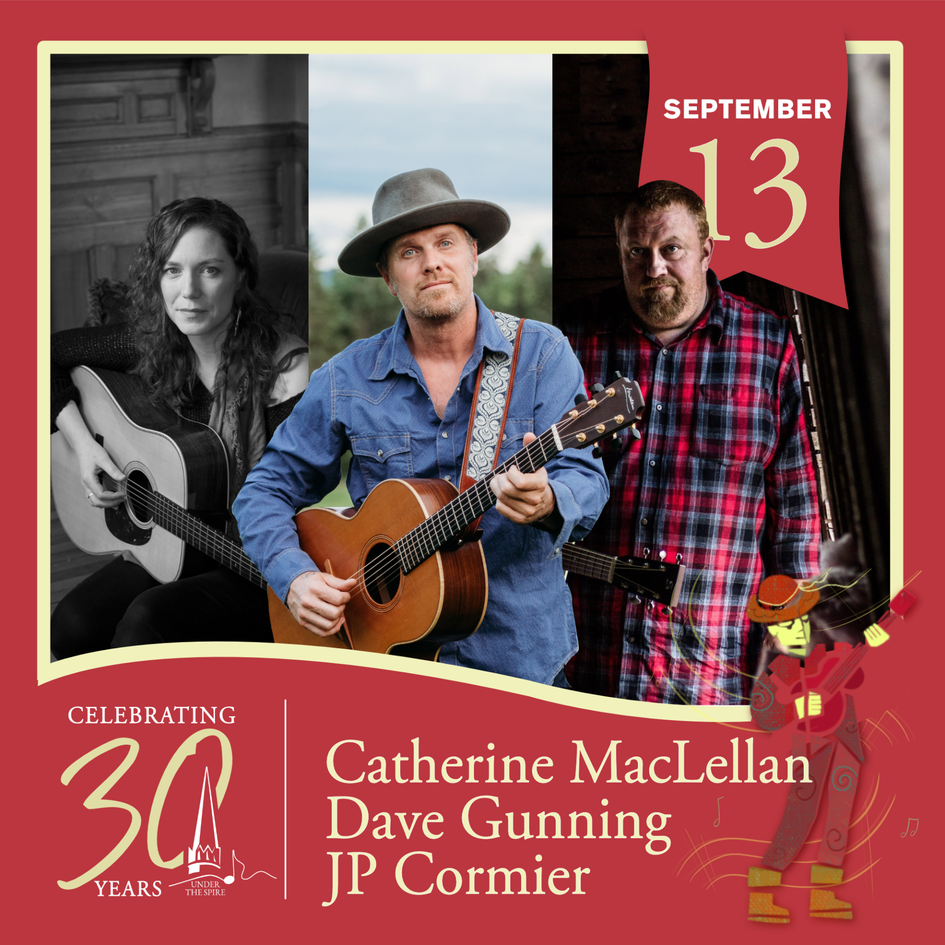 On September 13th 2025, Experience three of Atlantic Canada’s most beloved singer-songwriters sharing the stage at Under the Spire. Catherine MacLellan, JP Cormier and Dave Gunning will present an incredibly triple bill performance in the incredible acoustics of St. Mary’s.