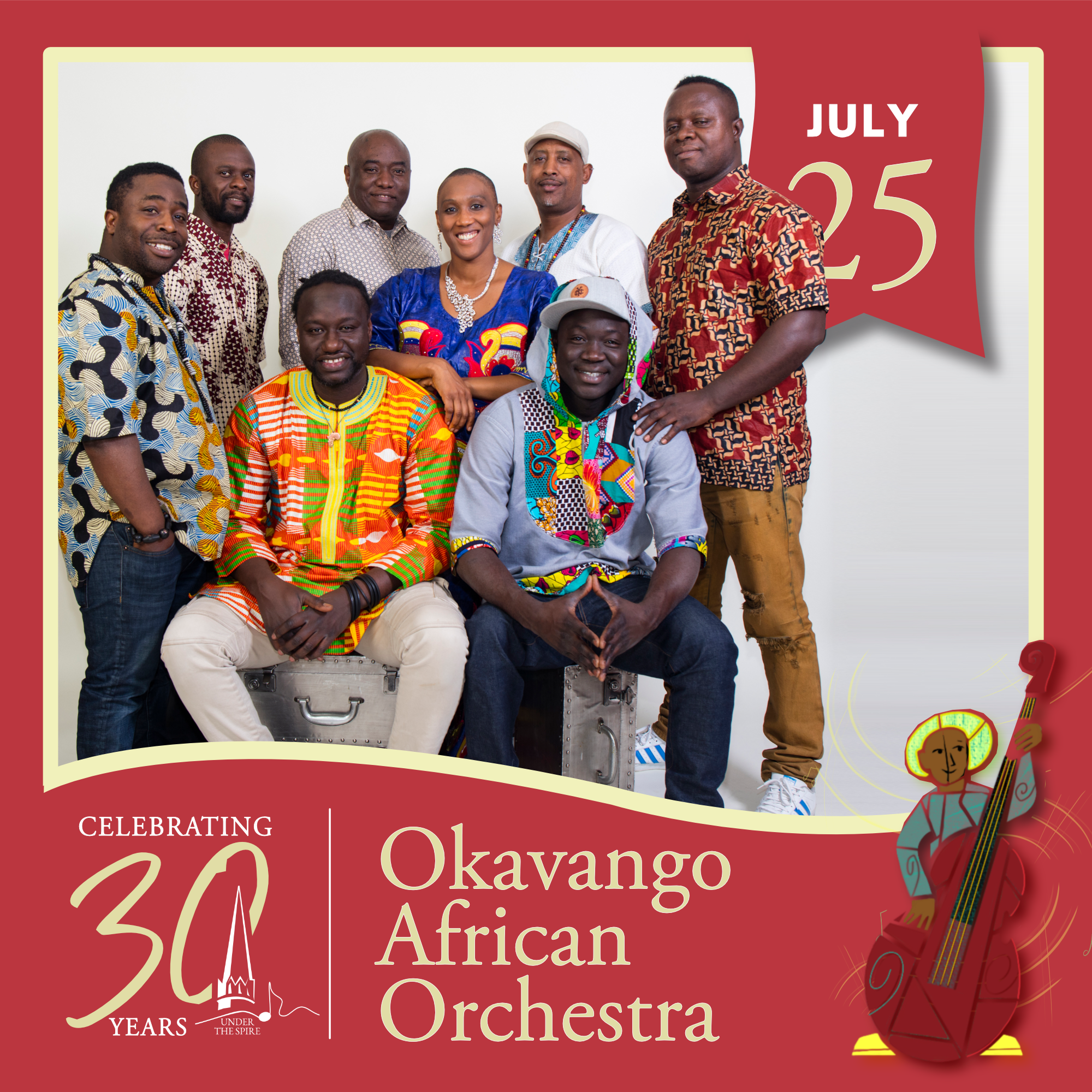 The JUNO award-winning group Okavango African Orchestra is an ambitious musical ensemble created by Batuki Music Society, Artistic Director Nadine McNulty assembled a cast of accomplished African-born musicians who now live in Toronto and Montreal: Daniel Nebiat (krar, composer, vocals), Kofi Ackah (percussion, composer, vocals), Tichaona Maredza (mbira, guitar, composer, vocals), Sadio Sissokho (kora, tama, djembe, composer, vocals), Ebenezer Agyekum (bass guitar, composer, vocals), Assane Seck (lead guitar, composer, vocals), Aron Nitunga (guitar, composer, vocals) and Mabinty Sylla (dance).