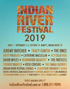 The lineup of artists for 2019 Indian River Festival summer season includes: Jeremy Dutcher, Tracy Cantin,The Once, Brett Polegato, Catherine MacLellan,VC2 Cello Duo, David Myles, Ironwood Quartet, The Fretless, French Squeeze, Rose Cousins, Indian River Festival Chorus, The Small Glories, Saskatoon Children’s Choir, Dmitri Levkovich & Agne Radzeviciute, Scandinavian String Alliance, Lina Boudreau, Montréal Guitare Trio, Shari Ulrich, Bach Sonatas with Mark Fewer & Hank Knox and MORE! 2019 lineup can be found here